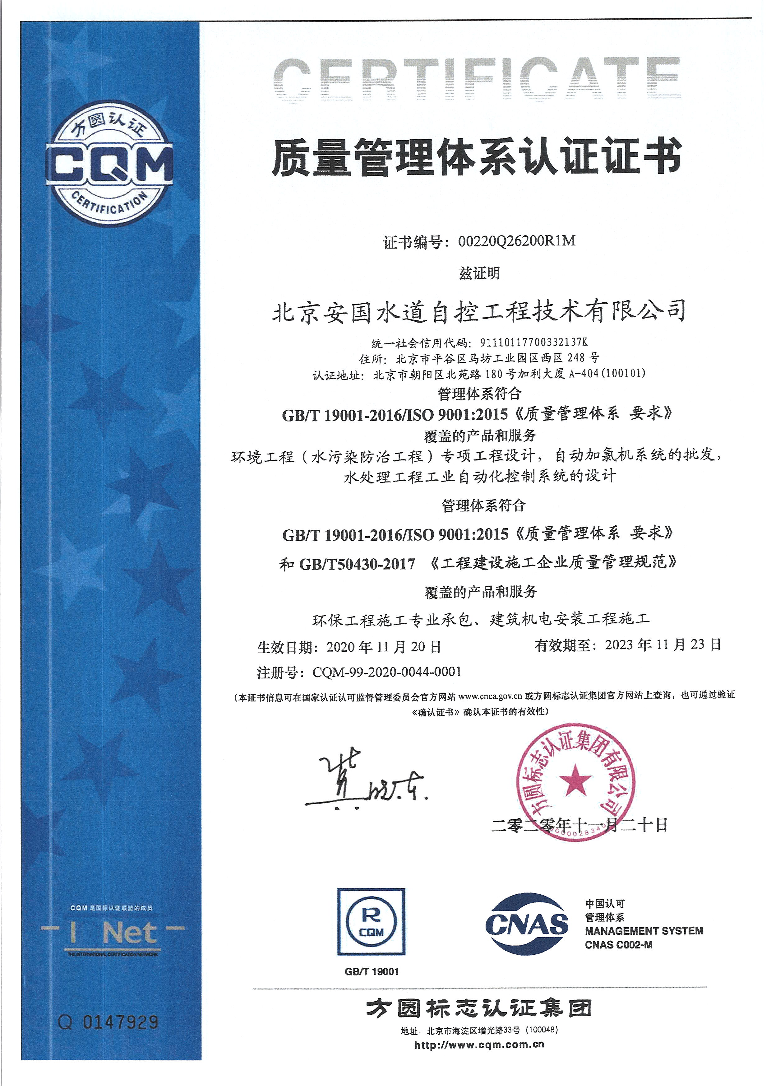 北京安國水道自控工程技術有限公司2015年入駐中國給水排水品牌委員會